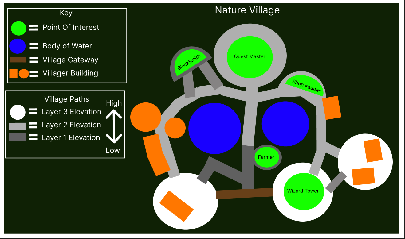 To ensure that the village had a unique Identity and to ensure I was spacing out the NPCs within a reasonable distance I made a few simple top-down maps. I started with paper drawings and eventually made a digital layout later on.